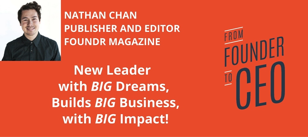 Can you imagine your business having an immediate impact on millions of people in just its first two years? Nathan Chan can. This humble Australian Founding CEO is building a media empire helping entrepreneurs, like you, build and grow your companies through his digital magazine, Foundr. We turn the tables on this inspiring leader and ask him about his journey from Founder to CEO. I know you’ll find his honest and authentic personal leadership stories helpful. For example, he discusses: